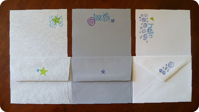 Stationery sets contain ten hand-stamped sheets and envelopes, usually utilizing hand carved stamps.